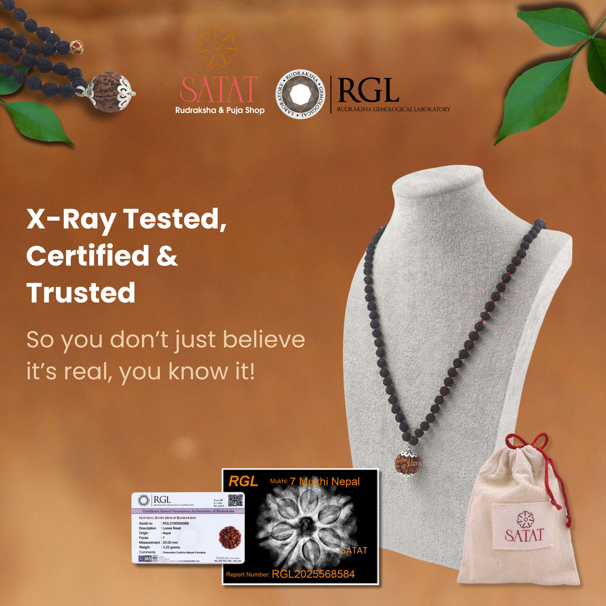 SATAT 7 Mukhi Rudraksha Pendant (Nepal) with 108 bead 5 Mukhi (Indonesian) Black Mala Set | Pure Silver Cap | LAB Certified