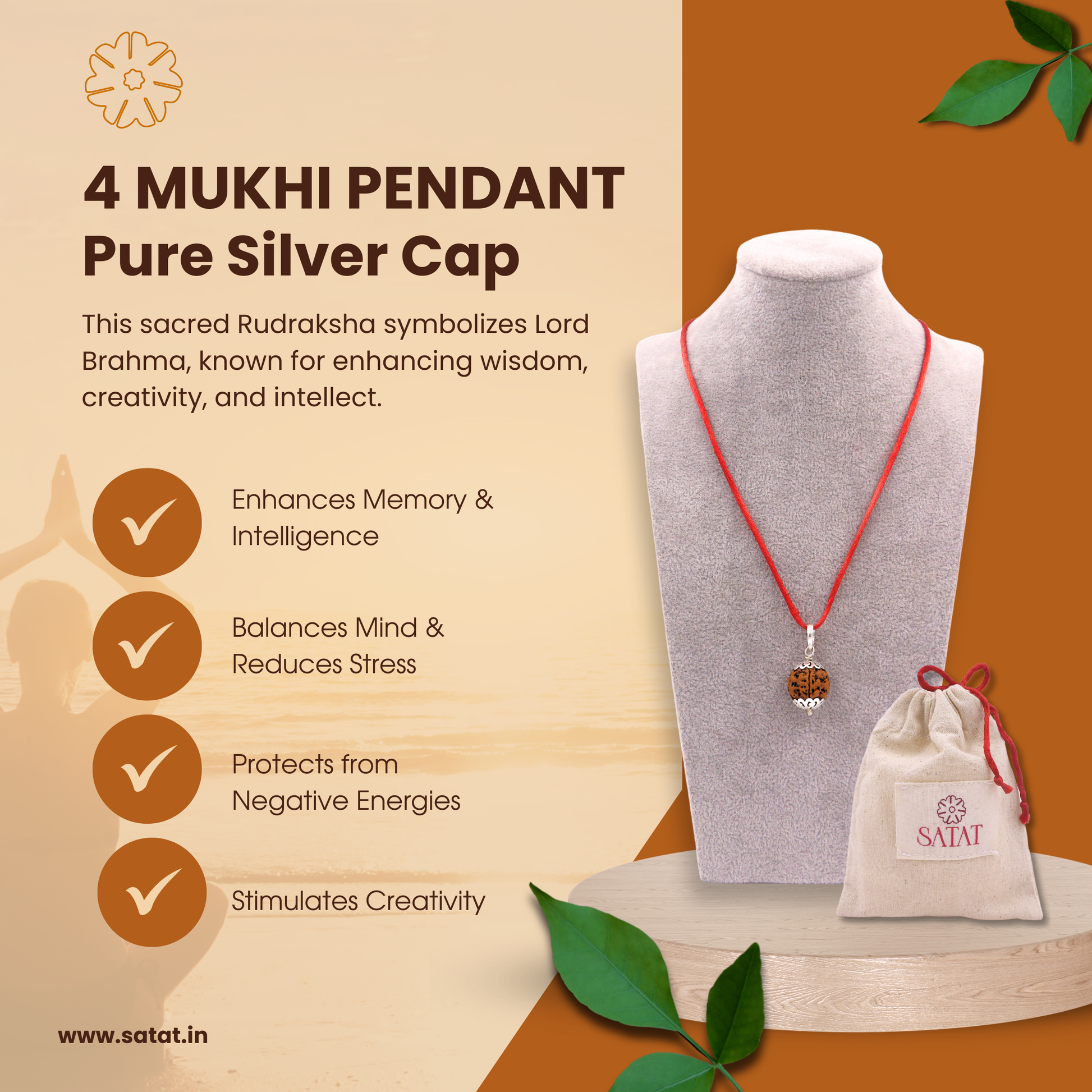 Featuring our 4 Mukhi Rudraksha Pendant in Pure Silver Capping. The 4 Mukhi Rudraksha is a sacred bead representing knowledge, intellect, and creativity, blessed by Lord Brahma. It is believed to enhance communication, boost memory, and inspire innovation, making it an essential tool for professionals, students, and spiritual seekers.
